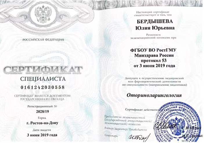 • 1999 г. – Интернатура: Ростовский государственный медицинский университет (оториноларингология);
