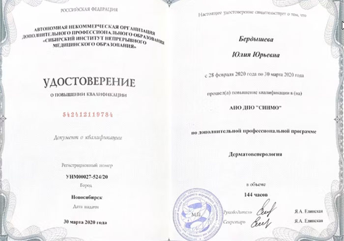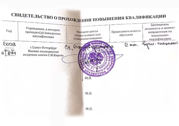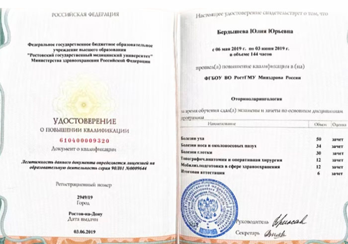 • 2019 г. – Повышение квалификации: Военно-медицинская академия имени С. М. Кирова (оториноларингология).